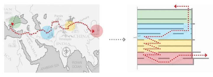 室内空间在“层叠城市”概念的基础上,融合了“古丝绸之路”的创意灵感,以同样的材质和逻辑,配合不同的概念提取元素,在四个“层叠城市”中设置了不同的主题空间: