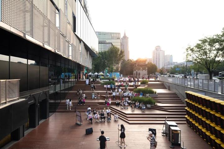北京朝外 the box 大盒子的西北侧,是一个通往负一层的沉浸式露天剧场,联合生活创意品牌在喧闹的朝外大街挖掘出一片咖啡美食与音乐、电影、书籍、策展和演出相结合的生活艺术栖息地。