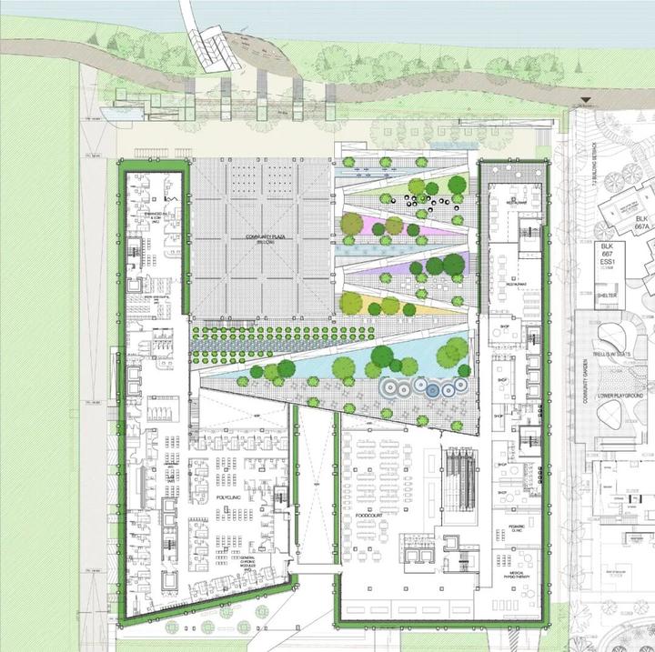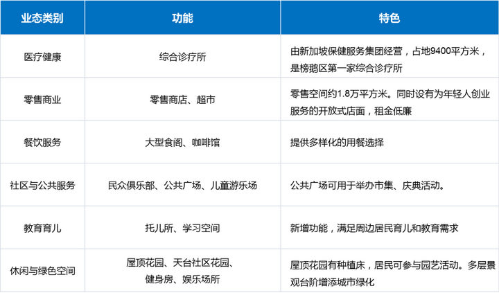 Oasis Terraces总建筑面积为27400平方米。与传统邻里中心相比,显著的特点是大幅增强了医疗健康功能,并引入了教育和育儿设施,使其服务更加全面,真正覆盖了居民从幼年到老年的多种生活需求。