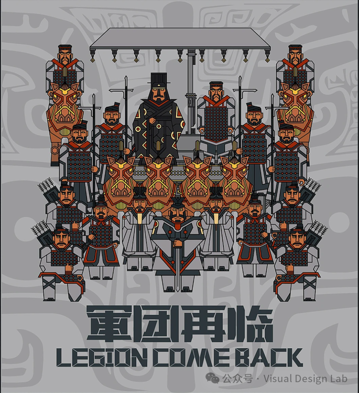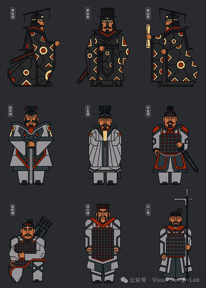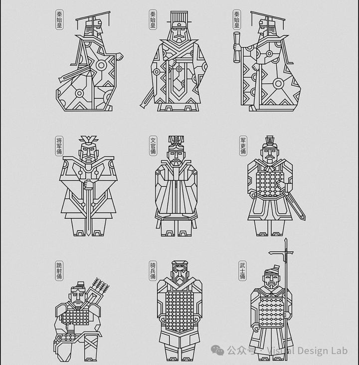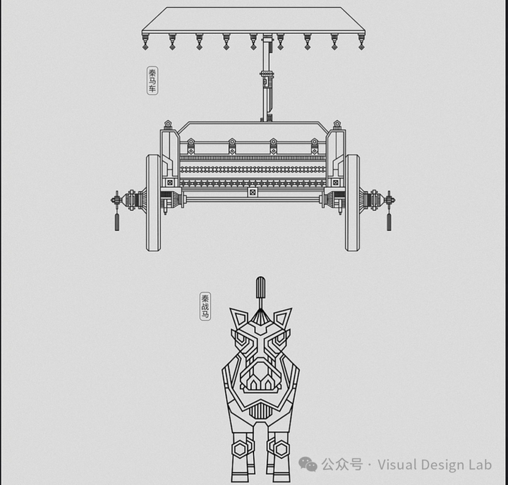 该设计以秦兵马俑、战车等文化符号为核心,通过几何化解构 + 未来感重构的手法,打造了兼具历史厚重感与潮流表现力的秦军团 IP 体系,人物覆盖秦始皇、将军俑、文官俑、军吏俑等兵马俑类型,保留 “高冠束发”“铠甲纹理”“兵器形制” 等核心特征,同时通过差异化造型区分身份层级;还原秦战车的 “伞盖 + 轮轴” 结构、秦战马的 “昂首立耳” 形态,强化 IP 的历史场景完整性。