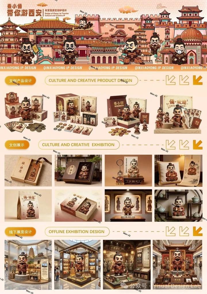该 IP 以秦始皇陵兵马俑为核心原型,是历史文物符号与现代文创生态结合的文旅 IP 实践,保留兵马俑的 “束发高髻”“八字胡”“铠甲纹理” 等核心特征,将文物的威严形态转化为 Q 版 “大头小身” 的萌态比例,既保留历史辨识度,又弱化文物的厚重感。