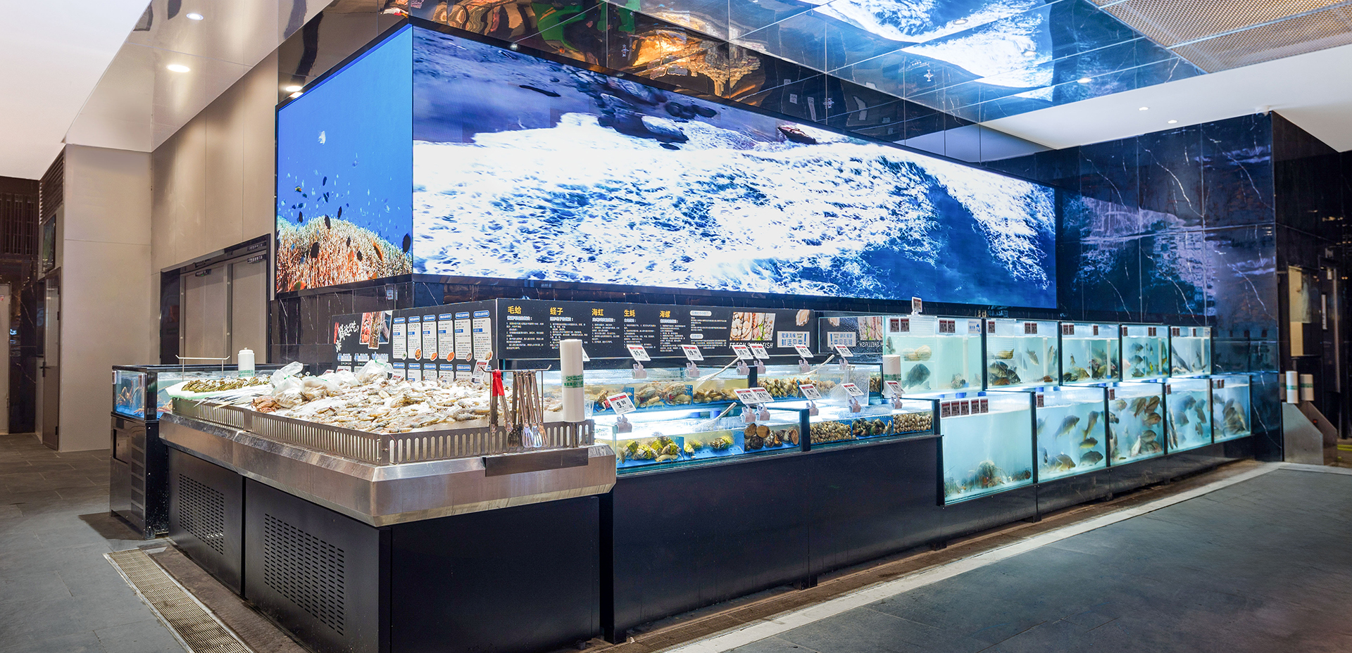 在这个卖场里面,我们抛弃掉重奢的材料,用了一些钢板和粗糙的红砖,原木、灰色地砖等材料混搭,随处可见的绿植、显示屏中流光异彩的自然界画面,有点冷冷酷酷,有点简单随性,而实质上是真实温暖,看着让人无比舒适和惬意。