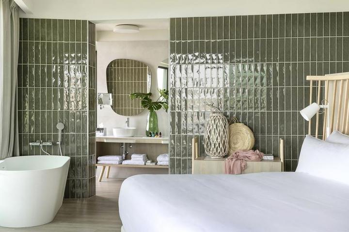 套房的设计稍显不同,主要是墙面采用了灰绿色的瓷砖铺成,竖向铺贴显得要更有立体感 ▼