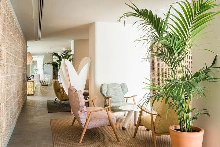 在酒店的大堂、公共区域,你能感受到空间充满了热带风情,有着非常素雅明亮的色调。在很多地方都摆放了盆栽,增强了环境的自然感。
