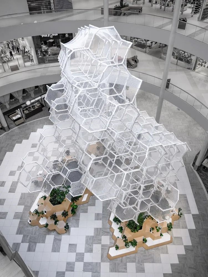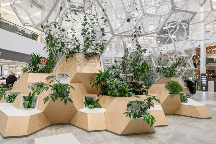 PART建筑师与KINO景观设计师合作,在爱沙尼亚 Ülemiste 区新的大型购物中心T1 Mall of Tallinn 以垂直公园的形式设计空间展示装置。该结构装置目的是为30米中庭的各个层面创造联系,并为人们提供一个舒适的休闲环境。