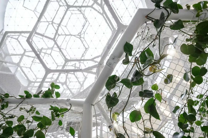 房间分隔基于有机增长算法,成为了植物在不同高度上攀爬和悬挂的面板。支撑结构(即算法单元)的基础由多面体构成,尽管为严格的几何形状,它允许在重复模块中生成填充空间的自由形状体积。
