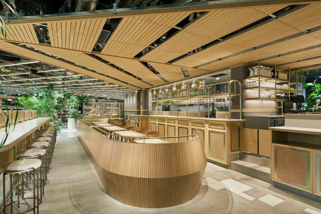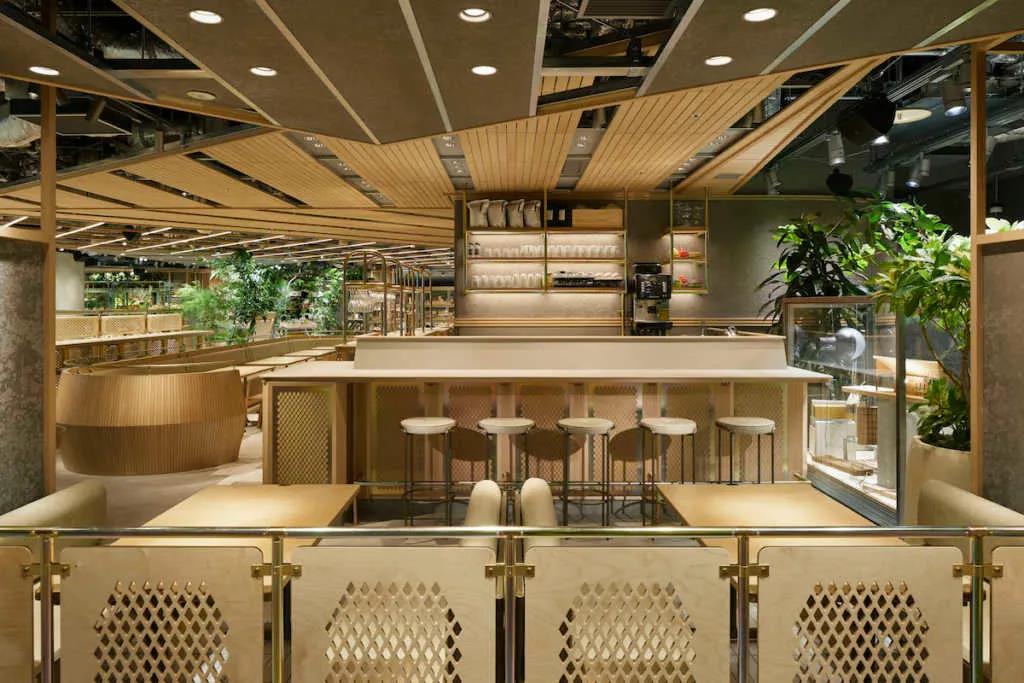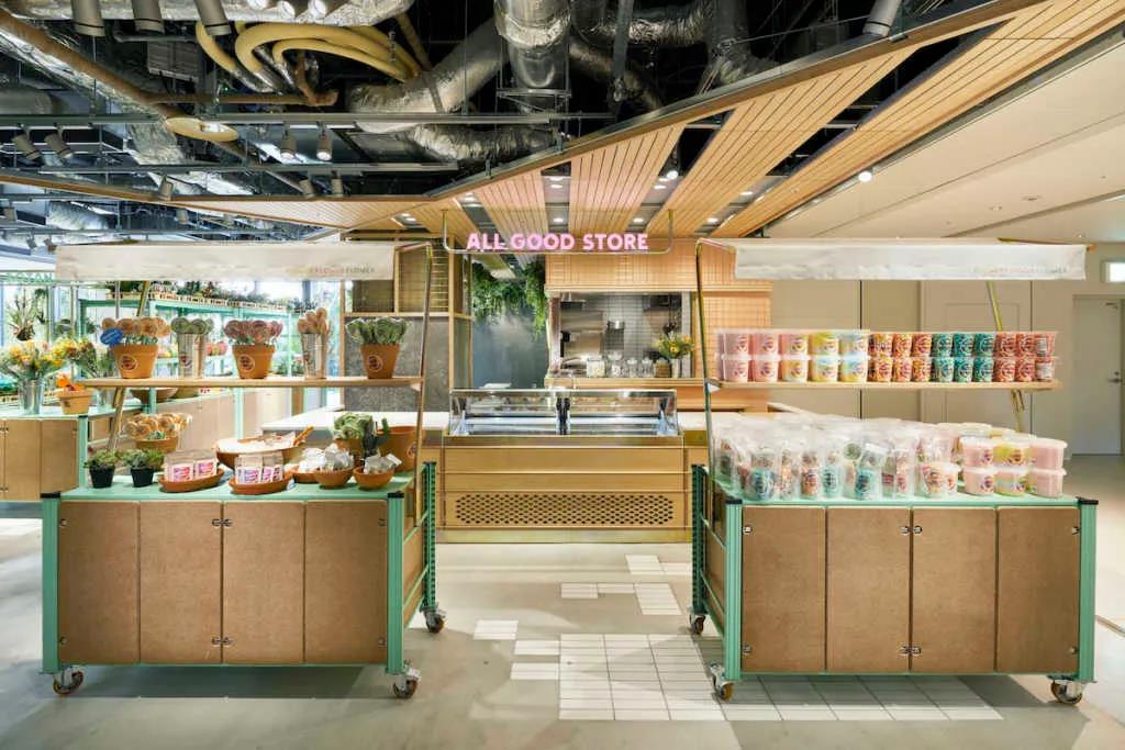 入口处具有海洋和城市的形象,而商店后方的露台则表达了森林和村庄,营造出不同的绿色表情。