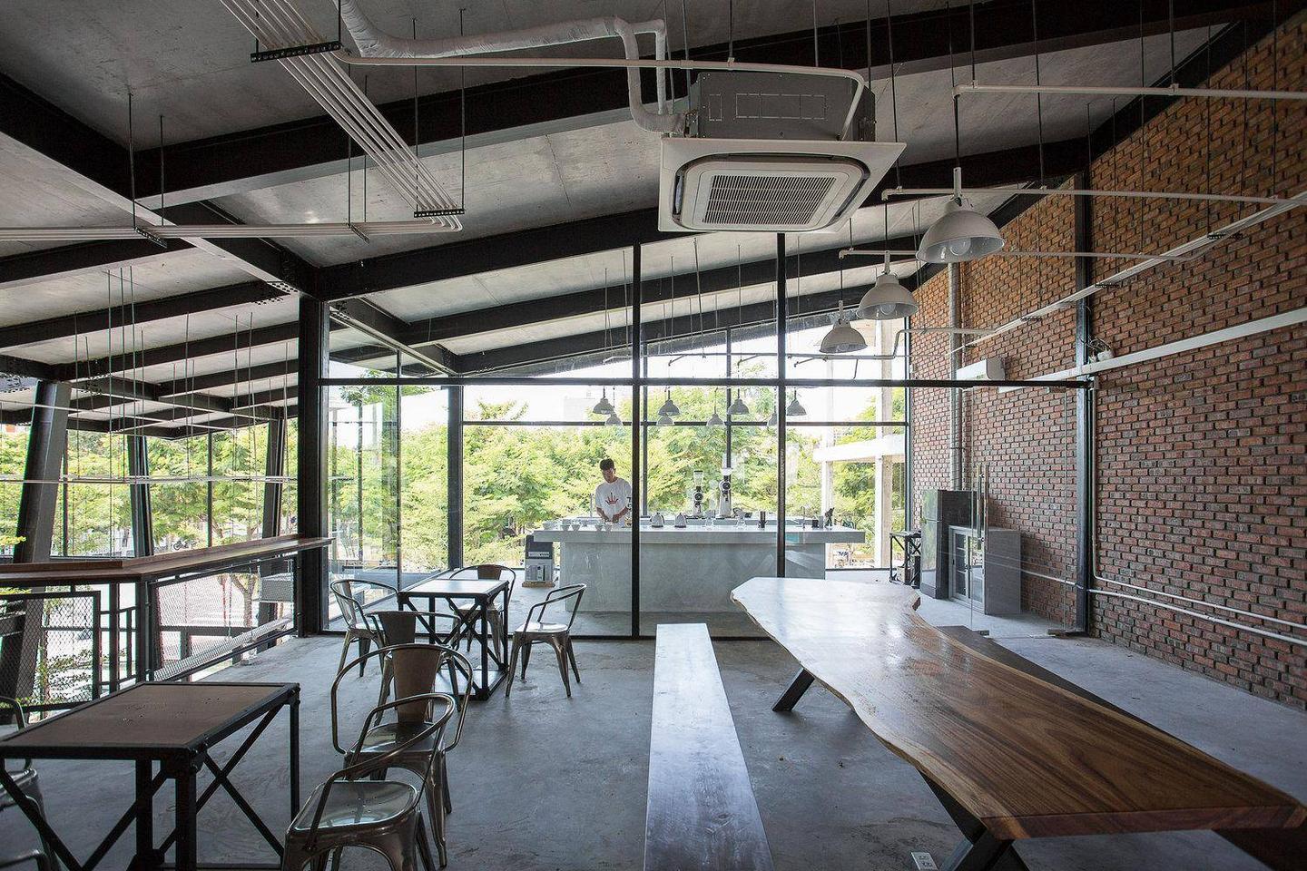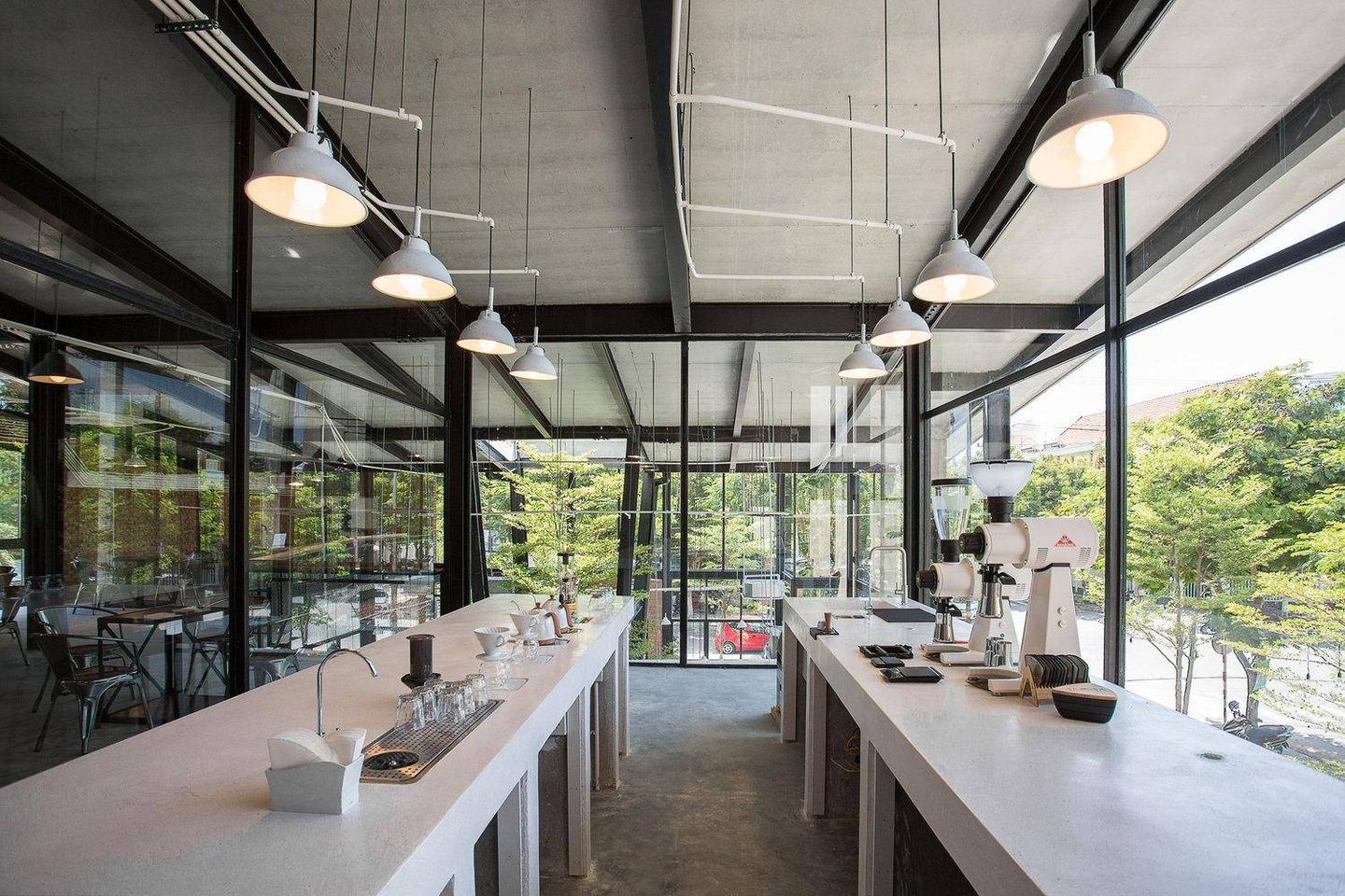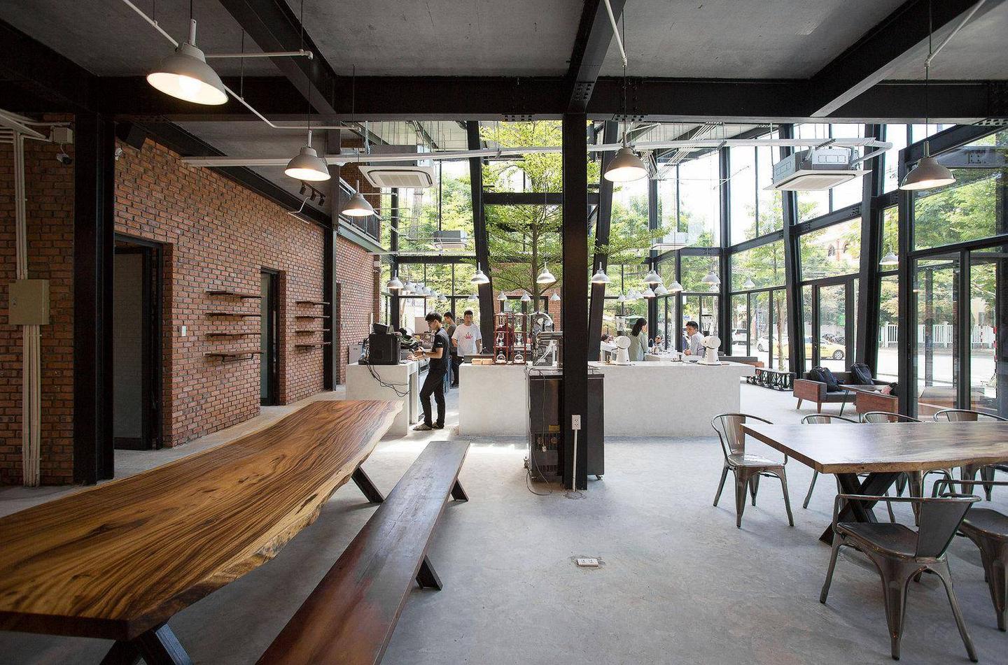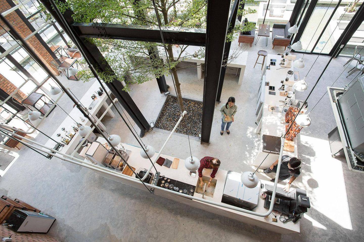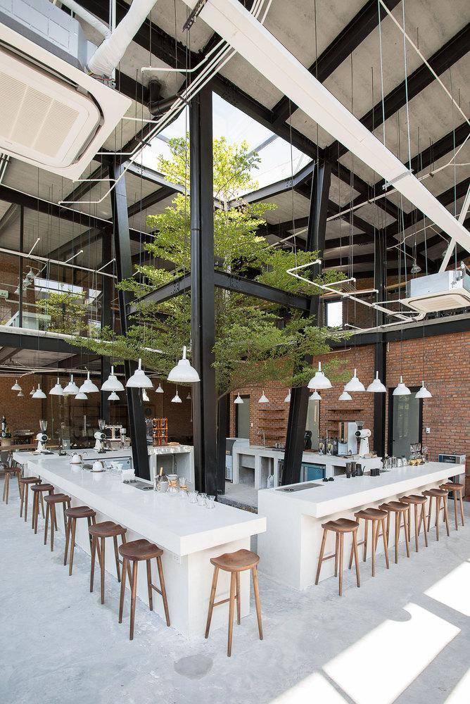 43 Factory coffee Roaster 是一个工厂模式的咖啡店,展示了制作一杯“从咖啡豆到咖啡杯”的流程。为了让顾客感受到制作一杯咖啡的价值,从挑选每一颗咖啡豆,到以精确的温度和时间放入烘焙机,直到研磨和萃取到每一杯咖啡送到顾客手中,这其中需要许多复杂而精细的程序,所以设计了一个完全开放的空间,使用了很多玻璃杯让顾客可以看到所有的“从咖啡豆到咖啡杯”的流程。