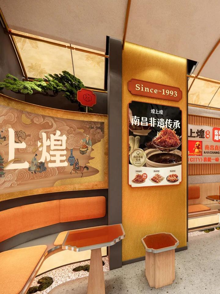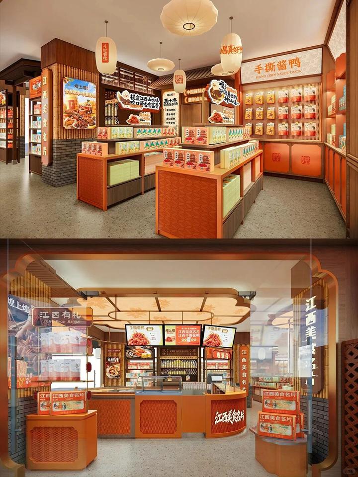 【煌上煌老字号文旅店】此案的核心设计逻辑,是把煌上煌 30 年卤味老字号的品牌基因,与江西地域文化、国潮审美深度融合,从传统社区店升级为「可逛、可买、可打卡、可传播」的文旅体验店,既服务游客伴手礼需求,也强化品牌的文化属性。