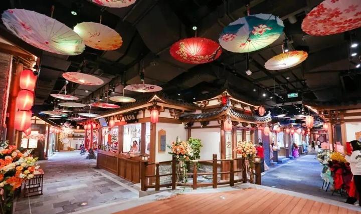 宝安大仟里购物中心打造的“清明上河图”国潮主题街区——上河坊,面积约有3000㎡,不仅打造了一个沉浸式场景,还将非遗传统文化融入了内容运营,可以称之为是一座中国历史文化博物馆。街区以“清明上河图”为主题灵感,共有三纵三横的北宋街巷,最大限度还原北宋汴京开平时期的繁荣风貌,融合美食与非遗文化的体验,为消费者呈现前所未有、耳目一新的文化体验。置身于其间,可见身着交领袍衫、襦裙长衫等宋朝服饰的店小二,稍适驻足还可细品似有若无的禅道檀香,听见轻轻吟唱的小调,这种浸润式的视觉、听觉、嗅觉立体体验,给人不知今夕何夕之感;容纳百味珍馐,汇集佳肴美食,由味及心,慢享细酌,邂逅美好食光;探寻向往的生活,弘扬汉服文化,倡导汉式生活,以汉服为载体,让汉服文化之美回归大众,复兴华夏礼仪文明;习武射箭,强健体魄,传统弓箭文化、骑射推广;玉器、陶瓷、珐琅、乐器等。