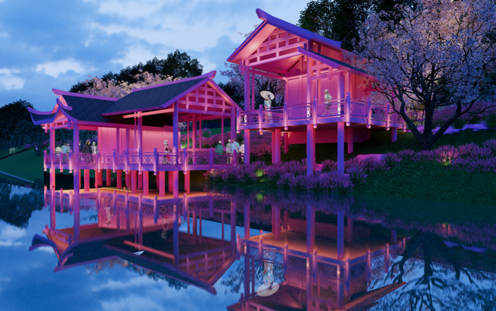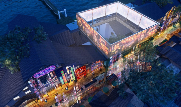 设计从当地文化中提取了湘西建筑、非遗手工、傩戏等众多元素融入街区,以粉色、红色等鲜明色彩让老街焕发活力,场景重现了湘西水岸的生活画卷。水街区用“边边场”(赶集、赶场的机会主动结交异性)的设计概念营造恋爱气息的街区氛围 ,再现一个可以满足现代人生活方式和情感世界的复古时尚殿堂,邂逅一场浪漫之旅。入口处以吊脚楼的坡屋顶作景观导视,结合错落布局以“Z”字形的动线规划引人入胜,如同在飞檐走壁,以另一奇妙角度观赏湘西建筑的飞檐吊角。原先的小吃街导视性杂乱,容易产生客流盲区,通过灯牌、街区动线、品牌IP形象的美陈打造,将历史文化以时空为载体的具象表达,呈现出未来感十足的复古朋克风。在色彩张扬,光影流动的街道闲逛,霓虹灯和冉冉升起的孔明灯时空交错,令人顿生之感。