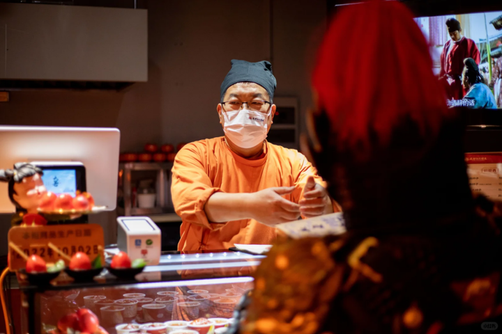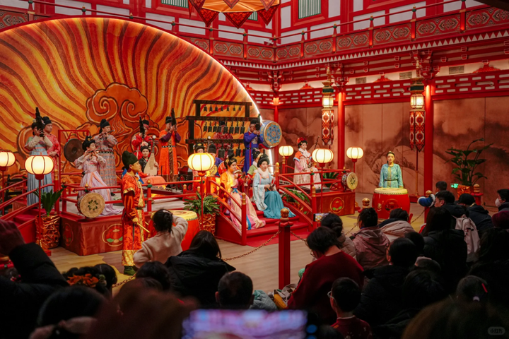 街区由《长安十二时辰》美术指导及原班美术设计团队搭建,还原了靖安司、花萼相辉楼等经典剧中场景,搭配日晷、沙盘等道具及12街巷、万余件软装等,营造出浓厚的唐朝氛围。在美食体验方面更是汇聚了庾家粽子、萧家馄饨等100余种唐朝长安美食与胡风美食,同时,街区还有《霓裳羽衣舞》《万邦来朝》等唐乐歌舞演艺与人物定点互动,还融入影视级VR项目“中华图志——上元长安”、AI换脸等科技体验,为游客带来虚实结合的游玩感受。