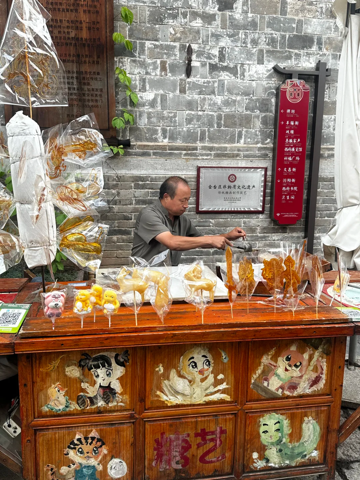 业态分布上,餐饮约占16%,购物约占56%,休闲娱乐约占18%,其他约占10%,涵盖酒吧娱乐区、四川餐饮名小吃区、府第客栈区、特色旅游工艺品展销区等区域,集中展示和推广三国宴、四川名小吃、蜀锦、蜀绣、漆器、竹编工艺品、川酒、川茶等特色产品。其中,金立的文化特色尤为突出,街区内包含27种非物质文化遗产,涉及民俗技艺、传统小吃保护等领域,如古法织锦、蜀绣、瓷胎竹编、成都灯影等,还有吹糖人、糖画等传统民俗表演,且在传统节日会举办特色活动,集中展现民间传统节俗。