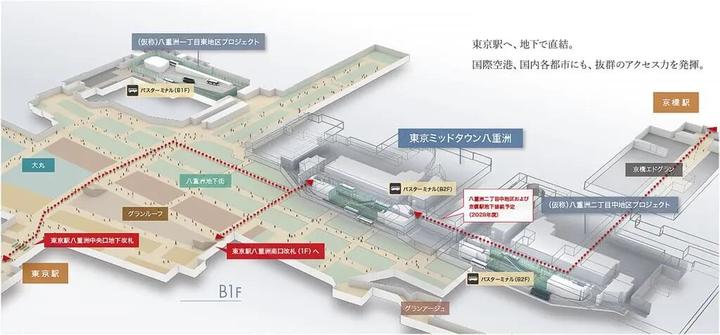 东京车站是连接日本各处轨交的始发站,东京中城八重洲就位于作为转运站及商业区的八重洲出口,这里汇聚着来自世界各地的人群。依托地理位置上的优势,八重洲与丸之内、银座、日本桥和新桥等周边街道逐渐发展成为商务区和观光购物的重要区域,但一直缺少广场等公共设施。东京中城八重洲规划了连结东京站和八重洲地区地下1层的步行商业街网络,并计划延伸到京桥站附近,地下二层设置有日本最大巴士转运站,打通地上地下广域的步行商业街网络,试图解决旅客迷路、拖着行李跋涉不便等问题。