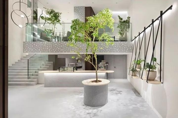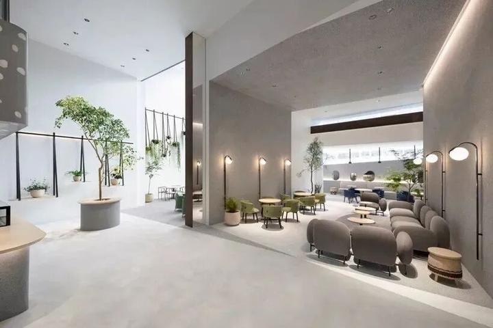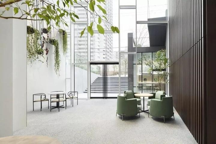 地下一层的咖啡厅,十分明亮,主要归功于玻璃立面和室内外的连接感。咖啡厅的设计也是有着相当清新的风格,绿植和天然感十足的材料、颜色搭配在一起,氛围相当的轻松惬意 。
