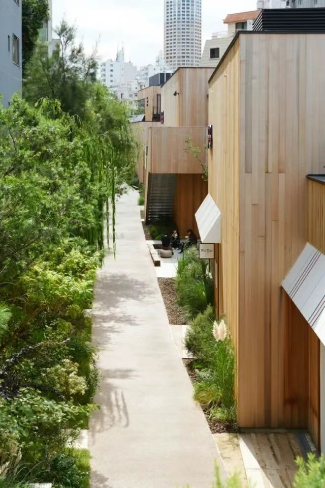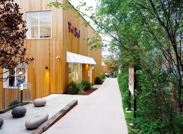 5栋现代简约风格的商业建筑及散步道组成的代官山LOGROAD在空间构成上继承了代官山住宅区的人性化空间尺度,略带坡度的散步道不仅巧妙连接了5栋建筑,还连接了原来被铁路隔断的东西两侧的街区,增加了街区的回游性。另外,在散步道两侧设置的人性化休憩空间也提高了空间的品质,大幅度提高了街区的舒适度。