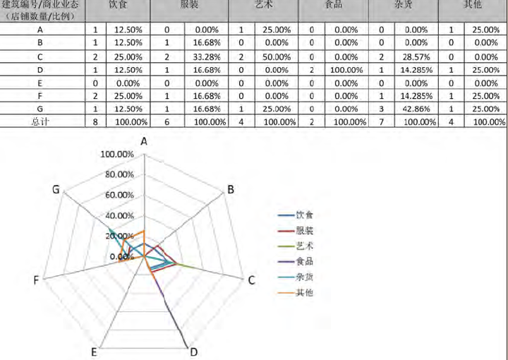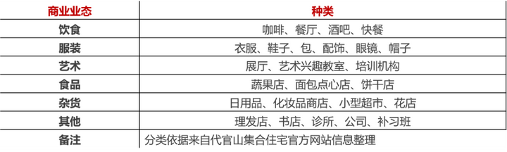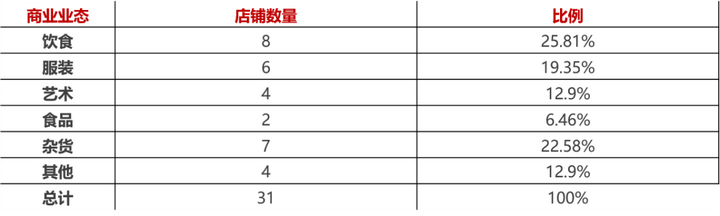 商业功能在整个建筑群中的分布范围较广,分布强度也显得比较平均。据不完全统计,整个建筑群中的店铺数量共有31家。总体来看,整个建筑群的商业业态以饮食店和杂货店为主。其中每栋建筑中都有一到两家饮食店,其次是服装店。