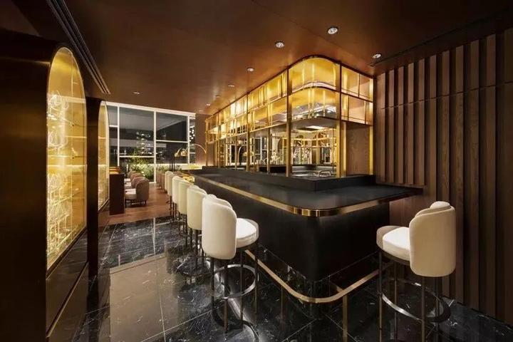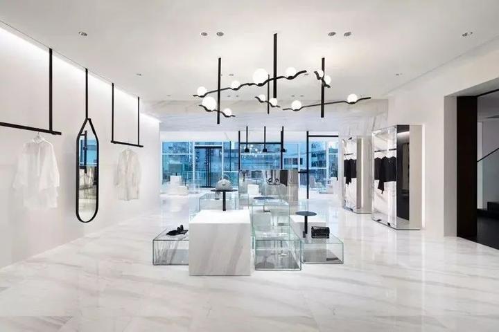 相比起二层的商店空间,三层显得更加精致和明亮。大理石是整个空间的重点,地板、天花板和部分展示柜都有采用。