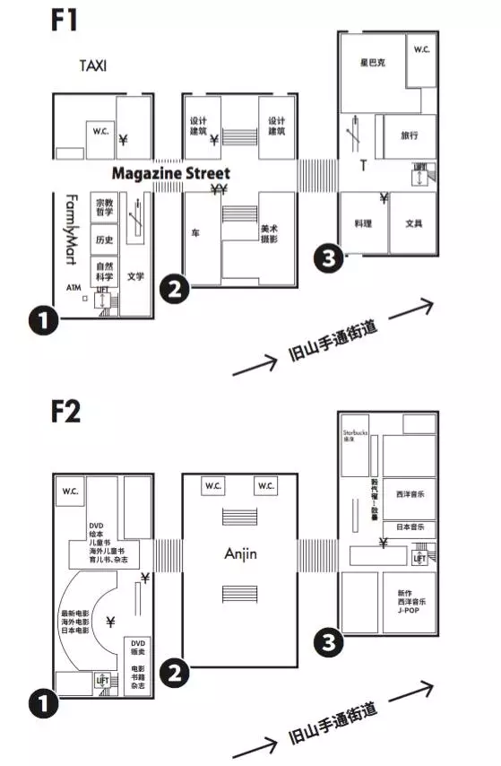 2号馆以一层的车、设计、艺术类书籍和2层的咖啡厅Anjin组成。