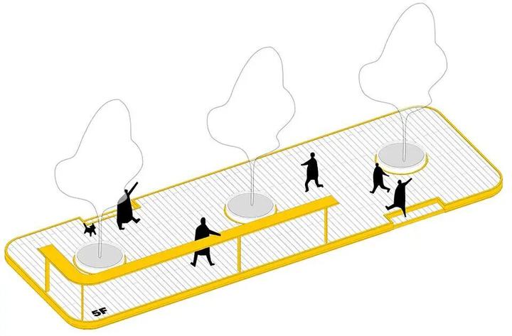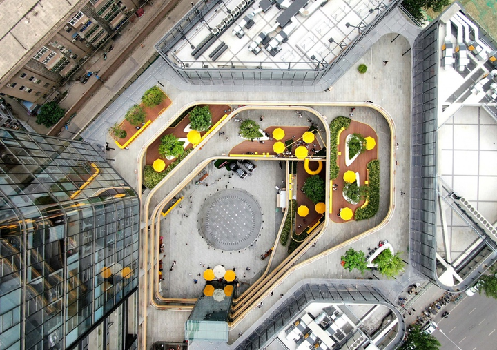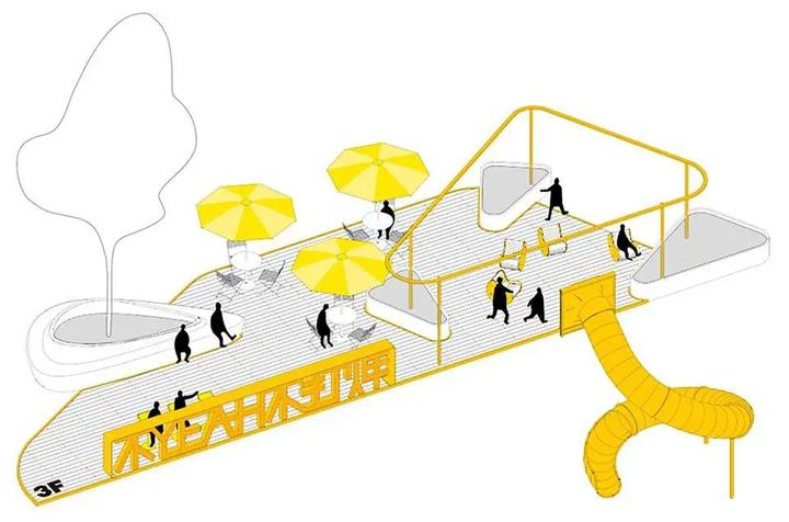 颜色上选择了与建筑完全不同的亮黄色,让景观设施更加出挑,增强它们的“装配式”的感觉,表达它们不是建筑的一部分。同时,这种颜色也让每一个小空间更加轻快、温暖和令人愉悦,在冷酷的建筑氛围中形成了一个个的避风港。