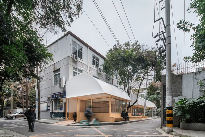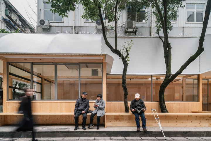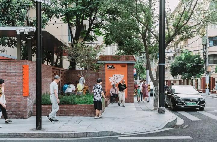 △ 融入花坛、座椅与雨篷的街角,既拓宽行走宽度,又留下邻里交流空间