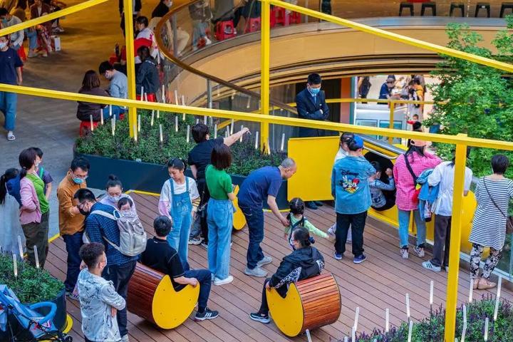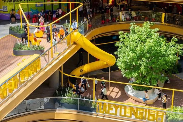商业景观设计的关键是如何配合商业引流,将人流引入各个商业区域。首层通常有着最大的商业机会。为了将人流引入二层以上,在二三层之间设置了旋转滑梯和旋转座椅,让其成为汇聚人气的打卡点。
