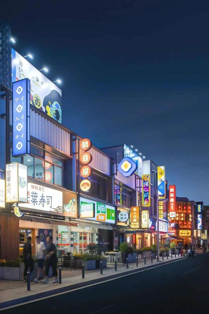 “霓虹”特色的亮眼店招点牌,配合低、中、高三个层次的矮柱灯、路灯、店招灯箱和路中央的渔网彩灯、造型灯,烘托出夜景氛围,一点点勾勒出街区特色,“日系”感油然而生。