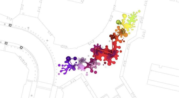 该装置是由8个反垂曲线形拱体组成的系统,这些拱形结构沿着设计好的路径相互连接,看上去就像是从高空滴落的油漆。拱形结构与地面连接的地方会形成一个巨大的滴溅色块,设计师将座椅和休息区设置在这里,从而为装置赋予了功能性。地面上的沉浸式图案更进一步增强了游客的体验。