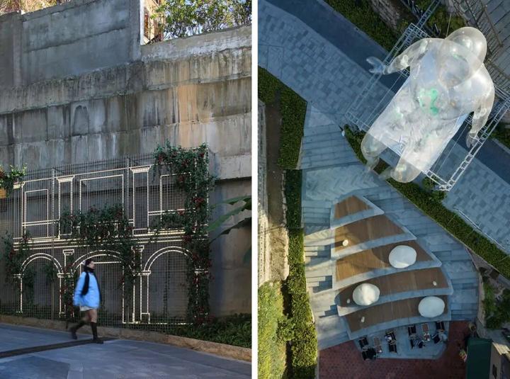 在这里,街景营造以主路径轴,不断向前的线性生长,构成整个区域的动线核心,并铺展出一种富有浪漫色彩的想象与情绪,设计初心是“城市轻氛围场景营造”,尽可能的去弱化原有街道本身存在的结构落差,输出视觉性强且舒适自然的创意点,让整个空间更连贯、自然。