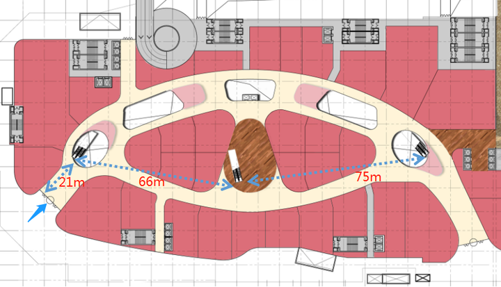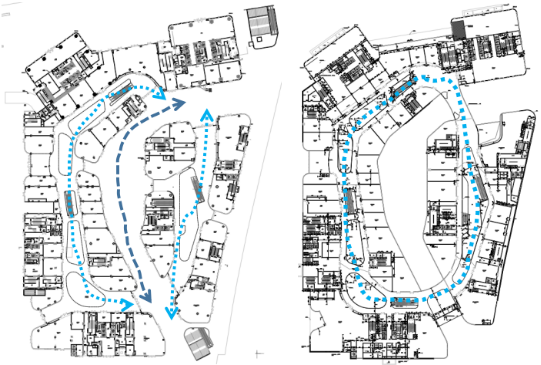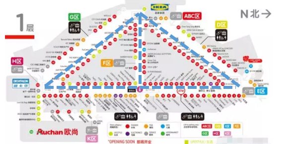 步行水平动线通常设计成折线或曲线的行走轨迹,人在行走过程中,人的视线通而不透,增加顾客视线内的商铺数量,避免商铺人流死角(可见性)。