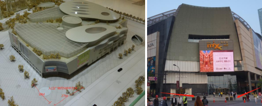 商业Mall主入口广场的尺度,作为缓冲空间,容纳各个方向来的人流,空间开阔;主入口正对市政道路交叉口设置,迎主要人流方向,主入口建筑立面处理成斜面,吸引人流导入。