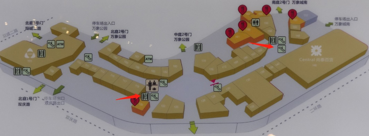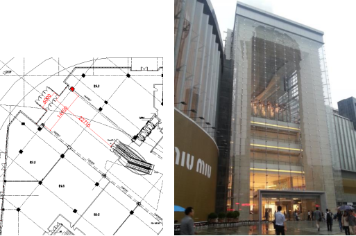 ▲ 北京三里屯太古里步行街b. 垂直电梯:设置在中庭或临近,2~3部一组;与商铺门面的距离应不小于4m,应通到地下停车场,以保证垂直交通的完整性。