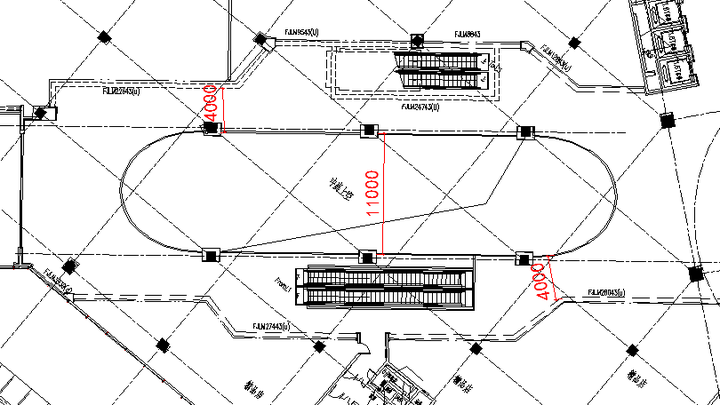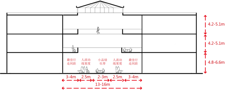 a. 点状主中庭面积一般控制在600㎡~1000㎡左右,挑空部位跨度一般在30m~50m左右,中庭周围走廊尺度:4m~5m。