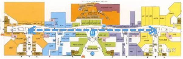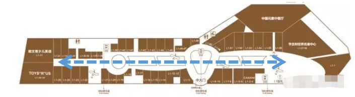 『一字型』水平动线:动线单一,尤其多用于扁长地形的特大型商业项目。