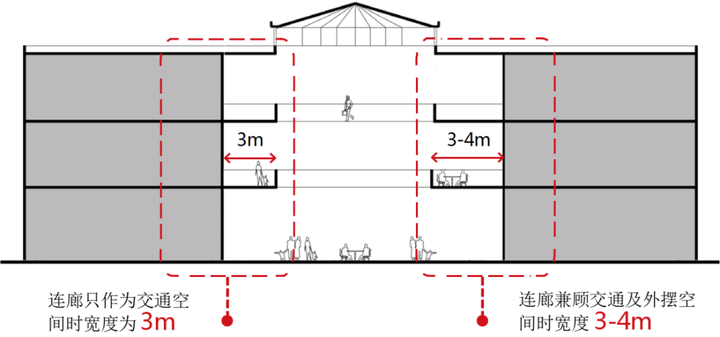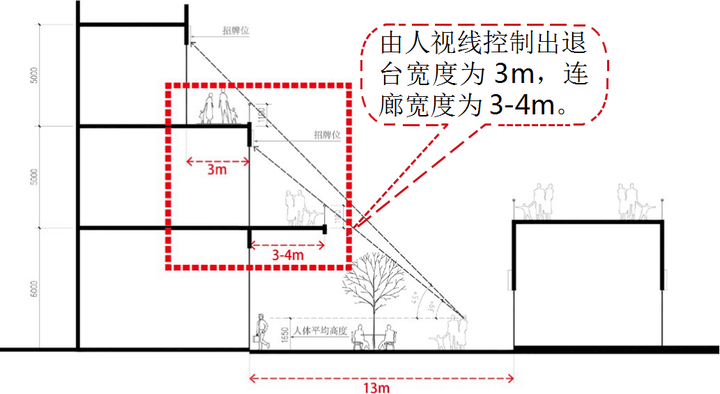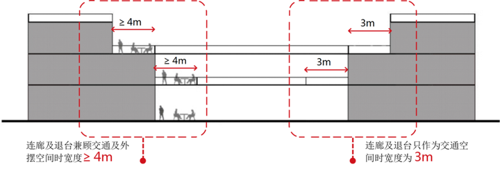 二层外挑连廊不宜过多,以避免遮挡首层商铺;
