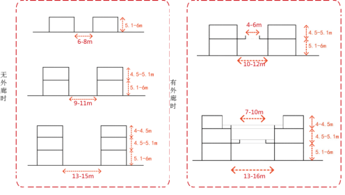 商业步行街宽度与高度的关系(一般都控制在 6m~18m 之内)。a.室外步行商业街(无外廊的、有外廊的)