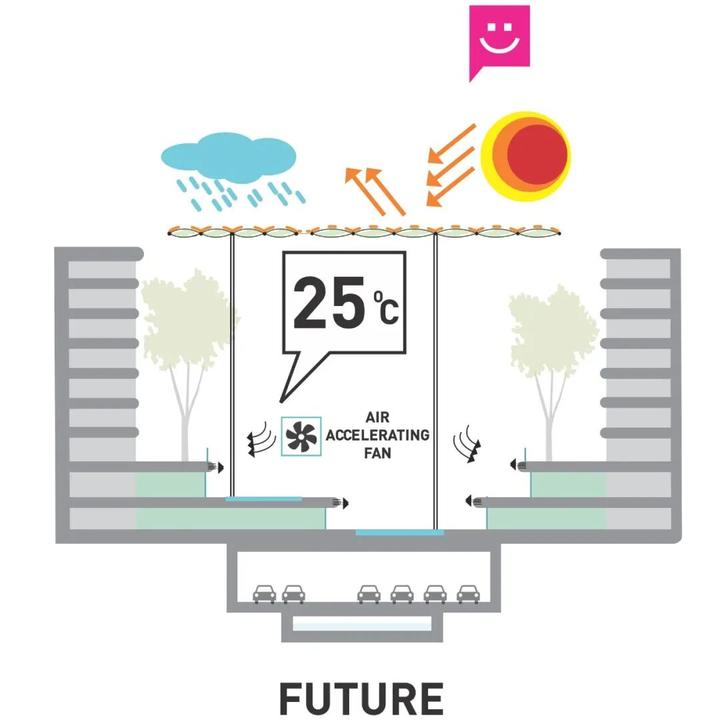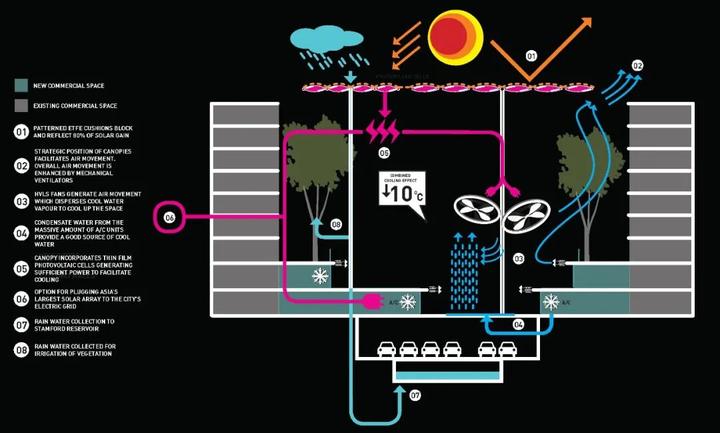 SPARK旨在将2065年乌节路的温度降低10摄氏度,这将通过天篷和专门建造的景观构筑物中的被动设计策略来实现。80%的紫外线将被阻止通过天篷,使温度至少降低5摄氏度。随着天篷上太阳能电池驱动的空气加速风扇的进一步作用,以及关键位置水景的水汽蒸发,温度将再降低5摄氏度。
