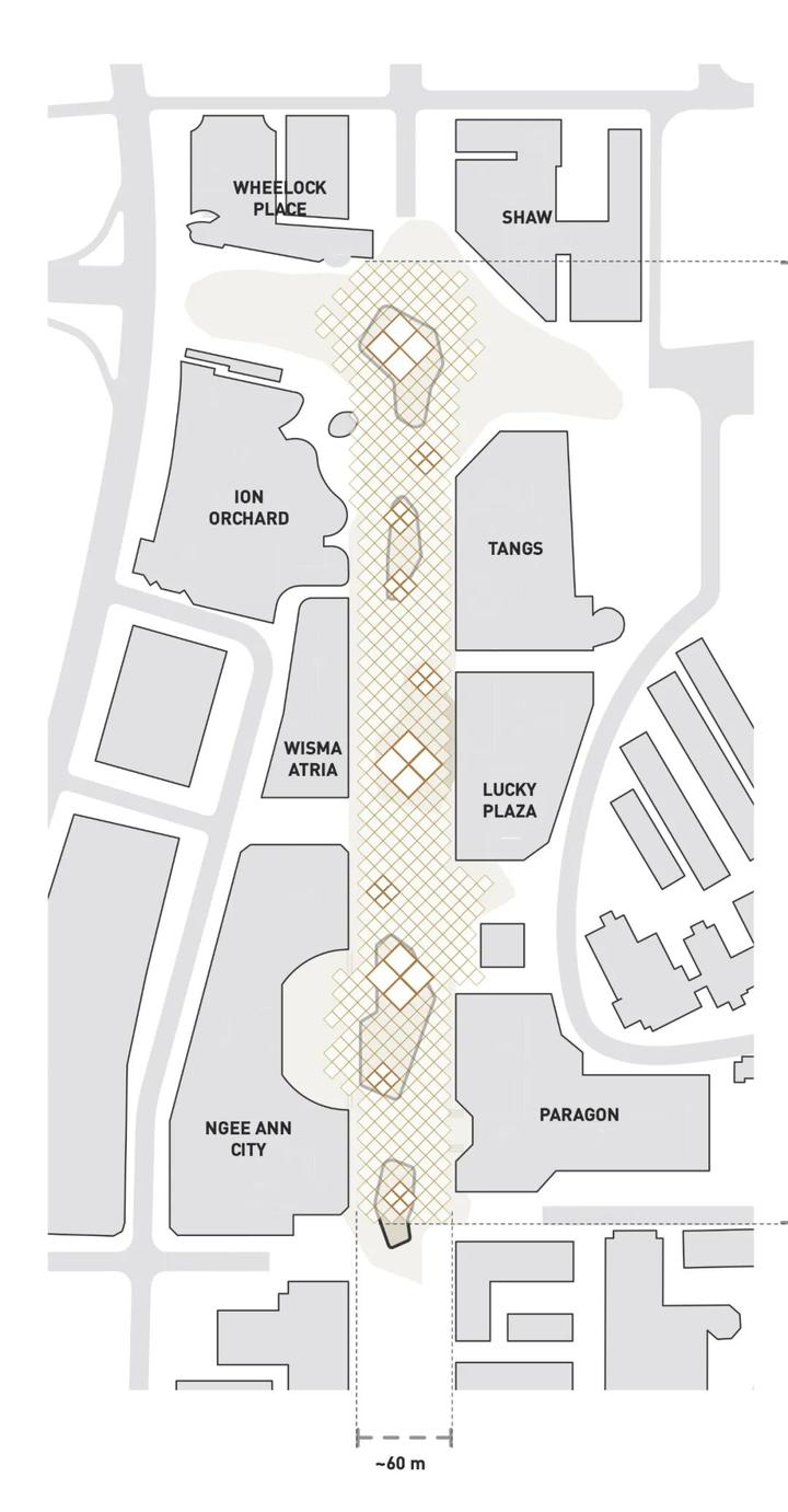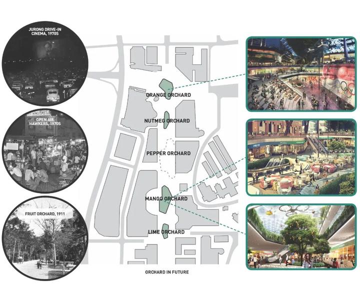 将主题广场引入2065年的乌节路旨在借鉴新加坡的一些历史,为单调的乌节路注入文化和各种活动。例如,曾经装饰过果园路的果树将被带回。肉豆蔻种子上的图案也以空洞的形状为参照,形成独特的空间。