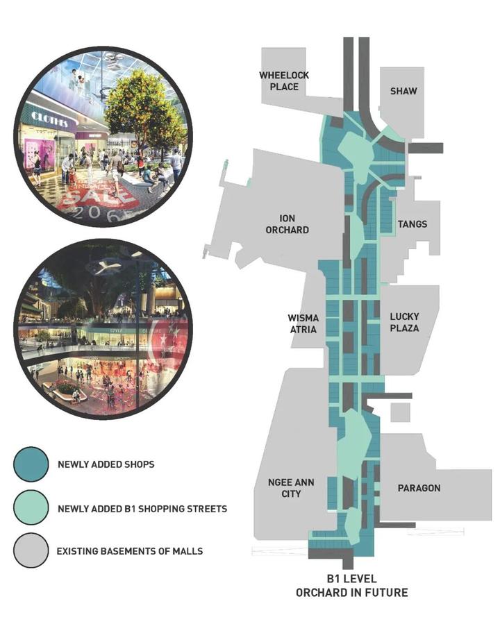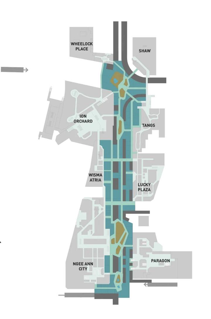 2065年乌节路的下层平台可提供60,000平方米商业空间,是一条线性购物街,内部有几个活动广场。乌节路路口的主环形广场连接着ION商场和义安城的B2层,也是人们乘坐地铁到达乌节路后的重要交通疏散节点。