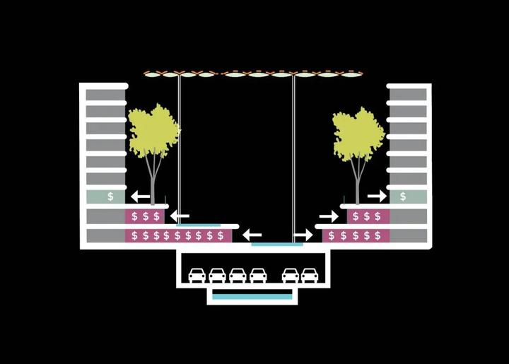 将地面上的汽车道路改到地下,是朝着创造一个行人友好环境迈出的重要一步。最具商业价值的地面层将腾出空间用于商业和社会活动。