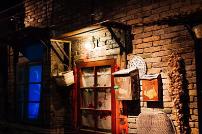 一进入和平菓局,首选映入眼帘的就是青砖墙,这些“断壁残垣”确实符合“挖出来的北京城”这一宣传概念,古朴庄重的青绿色和昏黄的灯光带给人一种历史的厚重感。