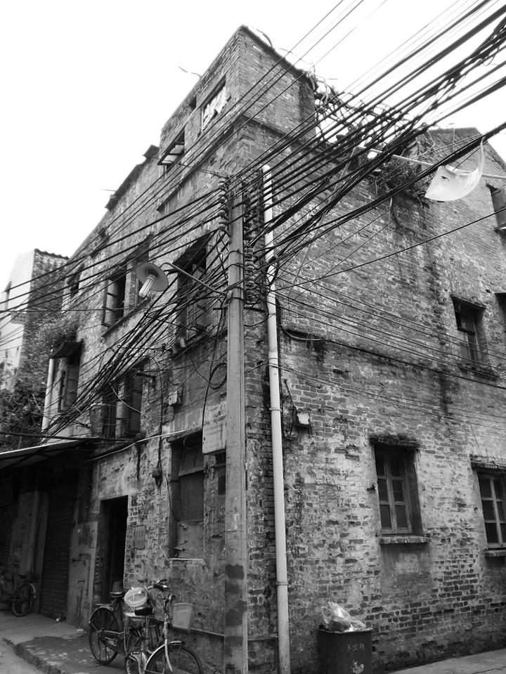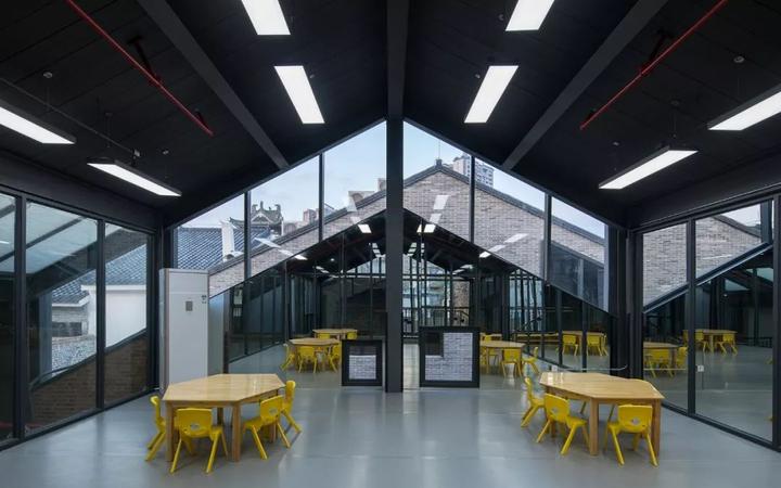 “塾”是一栋片区中培养小朋友业余爱好的教学空间,建筑本身由3栋红砖房组成,改造的尝试寻求一种中间状态。这3栋红砖房的现状结构相对完好,原砖墙之间也是实心回填;原混凝土结构密肋梁、红砖墙体,是不可多得的历史印记。