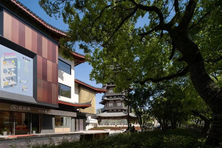 项目之初,对场地现状进行实地调研,现有商业街沿河道,以永安塔和银杏树围绕的广场,向城镇街道展开,以标准的马头墙和单檐歇山顶作为主要的传统文化展示,以及商业街与水岸间有供人休憩的长廊。首先拒绝大拆大建,保留原有中心广场、树木景观、建筑形式和风雨连廊等主体空间。