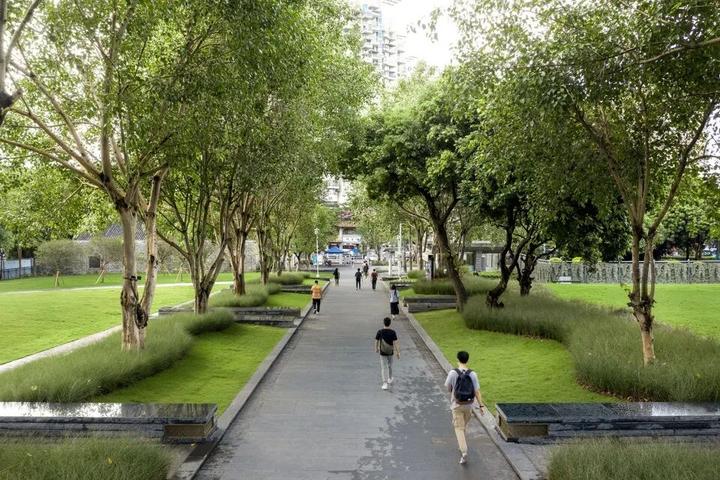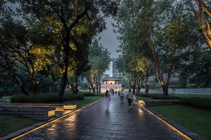 穿过牌坊就进入了南门广场,设计师根据场地内原有的道路将南侧打开的空间收窄于一条通向古城的线性空间之内。道路两侧原有的灌木被清理,取而代之的是秩序的行道树和开阔的绿地。