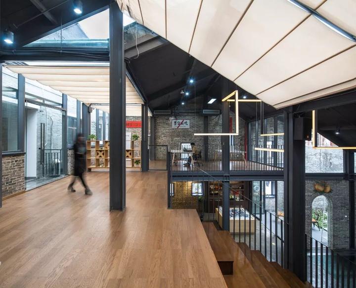 在旧砖墙的围合空间中,置入全新的钢结构体系,构建全新的屋面系统。新建屋面希望保留不同历史时期形成的折叠屋面的特色,并重建它的结构关系,形成新旧脱离又相融合的公共接待空间。新材料与构建在“云”的改造中更为强势,既是旧材料的支撑体系,也是新材料引申出的新建构方式,在历史街区的完全表达。