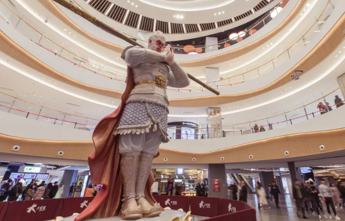 在场景搭建上,西安大悦城以趣味化的手法展开了内容的构建,将大话西游元素充分融入街区每一处。如,根据不同的故事情节,项目团队设置了丰富的语境,将融合了诙谐“基因”的台词、金句、段子创作于地面、墙面上,或是通过多角度射灯投射至地面;墙体材质、照明设计、公共服务设施造型,人们所到、所感之处均借由本土文化符号进行了主题化、立体化的软装设计,成为主题故事的“讲述者”。