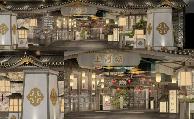 在场景搭建上,整个街区以“清明上河图”为主题灵感,构筑三纵三横的北宋街巷,充分还原古都汴京的繁荣风貌,营造“古街风貌”的场景,打造龙门客栈、开宝塔、望月台、相国寺、宋井等盛宋场景。