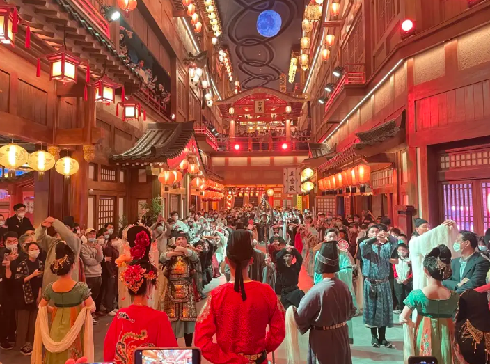 街区借助电视剧《长安十二时辰》IP ,以“全唐”市井文化生活体验为文化主题,并通过建筑、软装、人物、故事、音乐、器物等方面全方位还原唐朝文化。