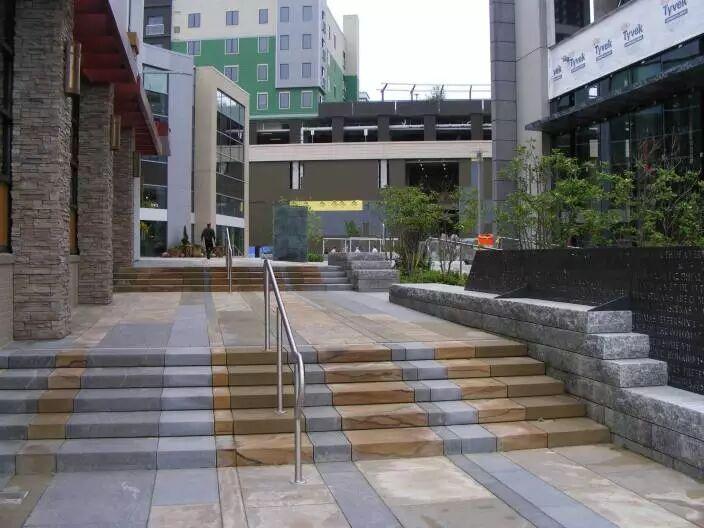 该设计采用当地地理,地质和生态学的线索。靠近地理秋季线,广场中心的喷泉通过模仿瀑布引用这个接近。条纹石铺路是对该地区典型的沉积基岩的抽象概念,也是该地块的基础。