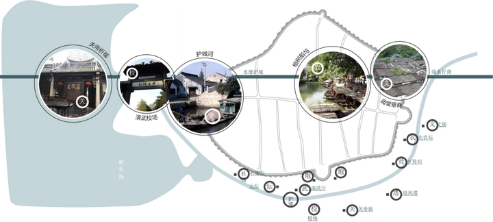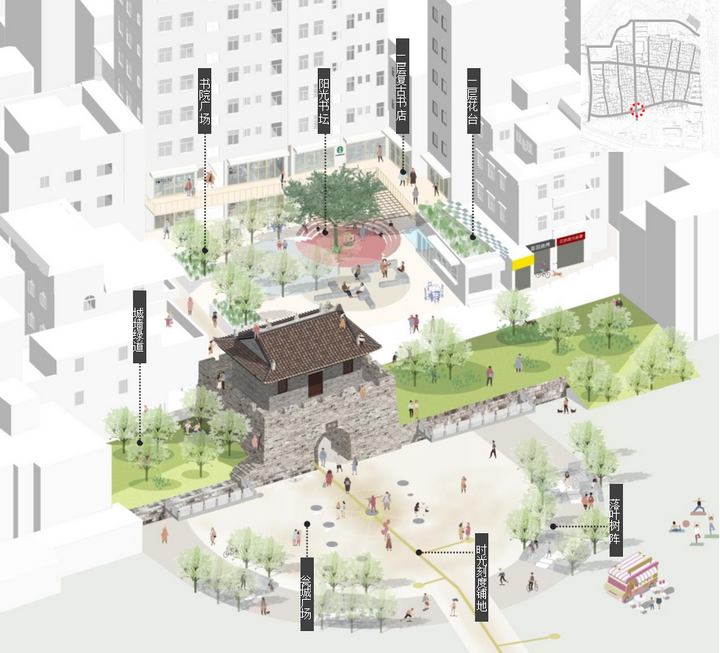 南城门广场作为守御镇海、登高点兵的重要历史节点,植入现代化功能,活态复原城 墙、瓮城广场、书院广场,营造活动与历史古迹紧密结合的体验式遗址景观,激发文化 遗产复兴,重塑古城门户第一印象